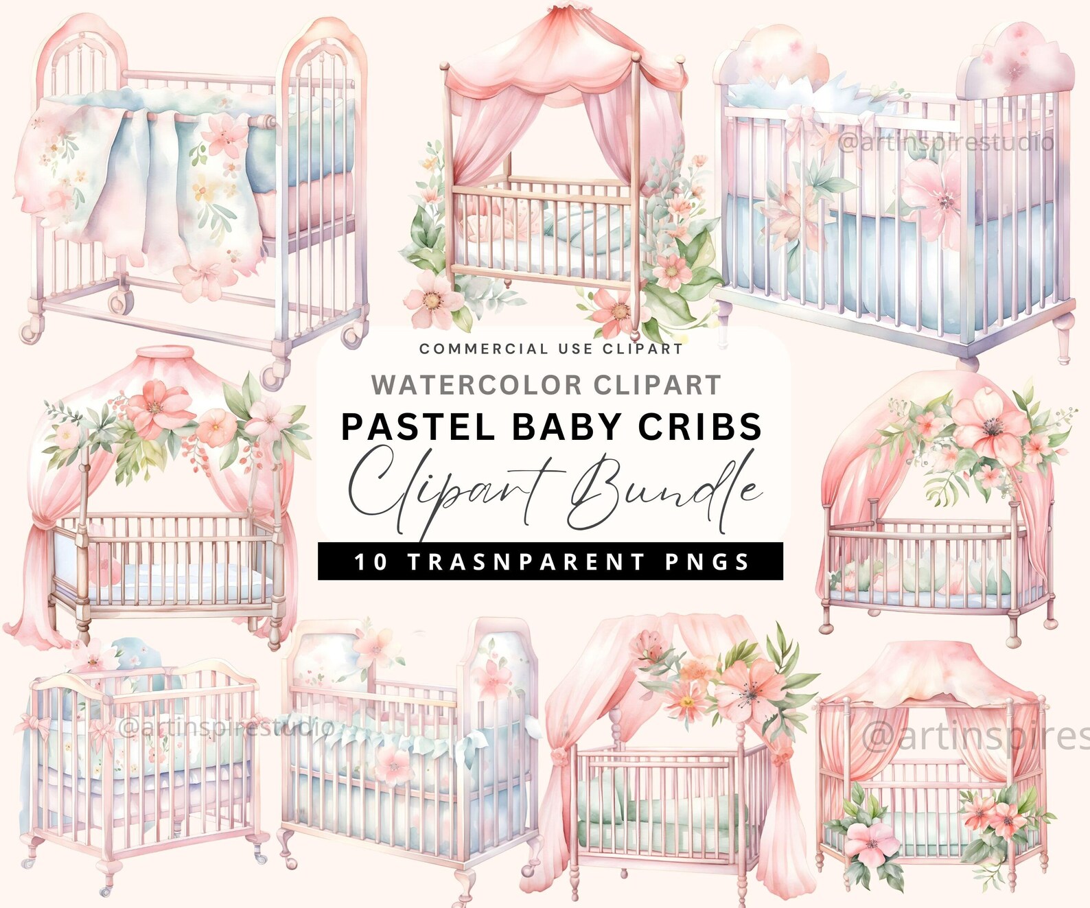 Create heartwarming invitations, nursery prints, baby shower decor, and more with our hand-painted Watercolor Crib & Nursery Clipart Set! This adorable collection features Moses baskets, rocking stands, cozy cribs, and soft pastel elements—perfect for your next baby-inspired creation.
