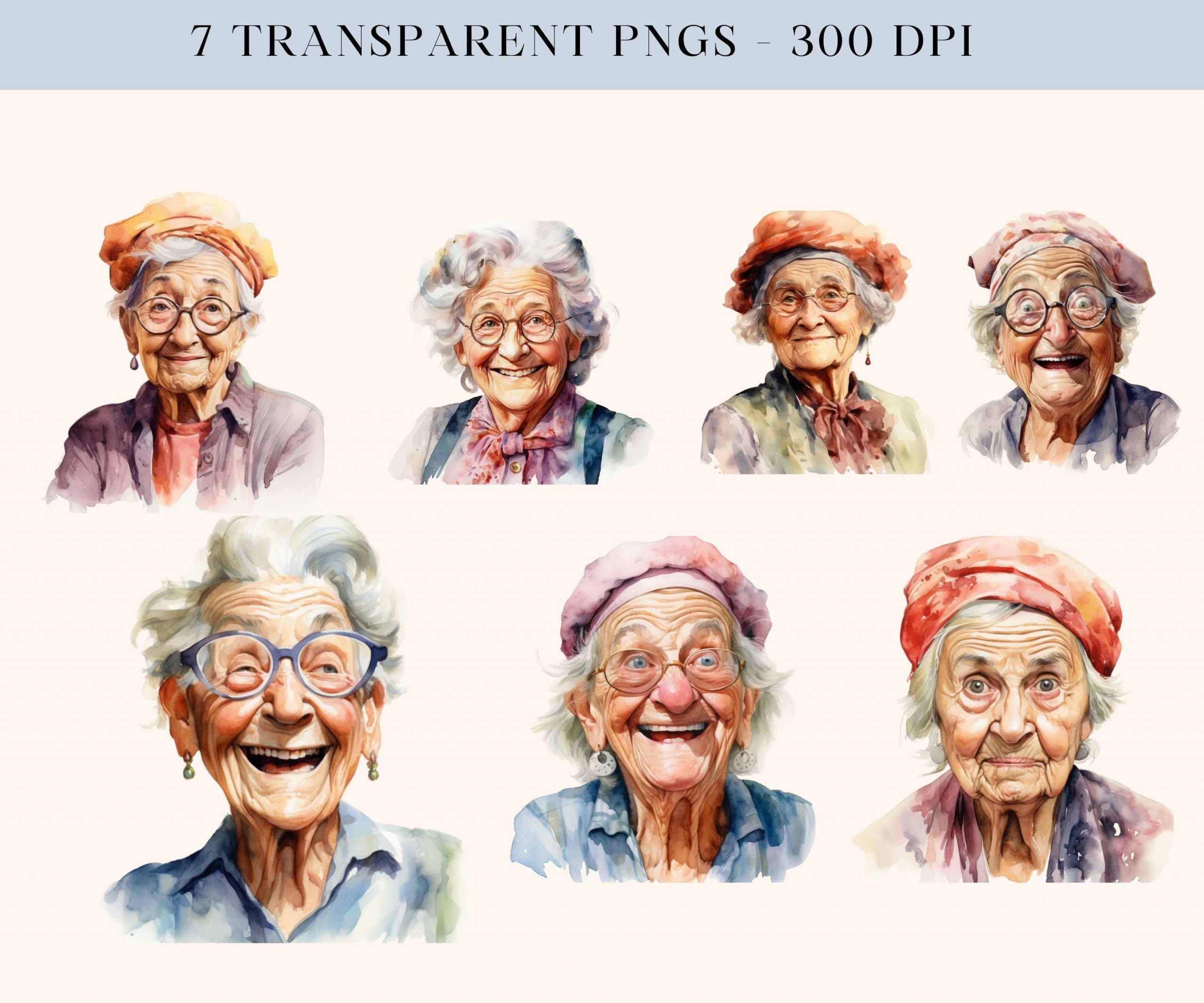 Add a splash of humor and heart to your projects with this whimsical watercolor set featuring 7 lively elderly women full of personality! These high-quality PNG cliparts capture the joy, sass, and charm of golden years—perfect for retirement cards, birthday invites, funny stickers, and more.