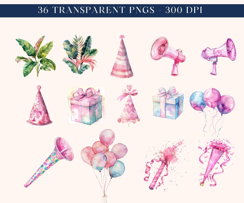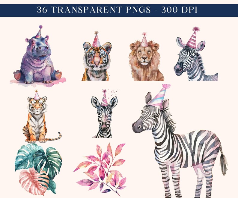 includes 36 PNG Party Animals Cliparts saved as transparent PNGs