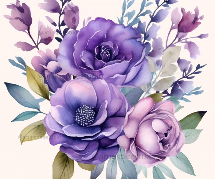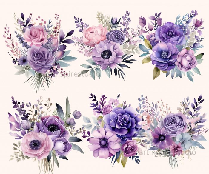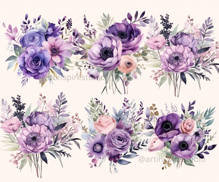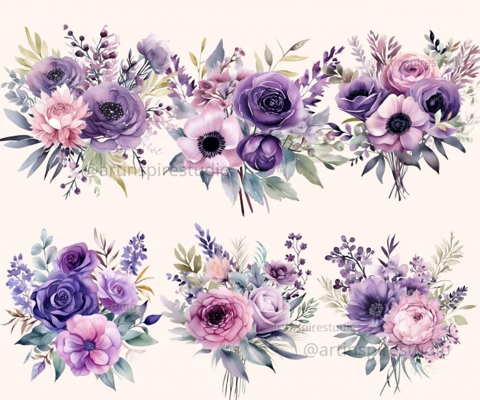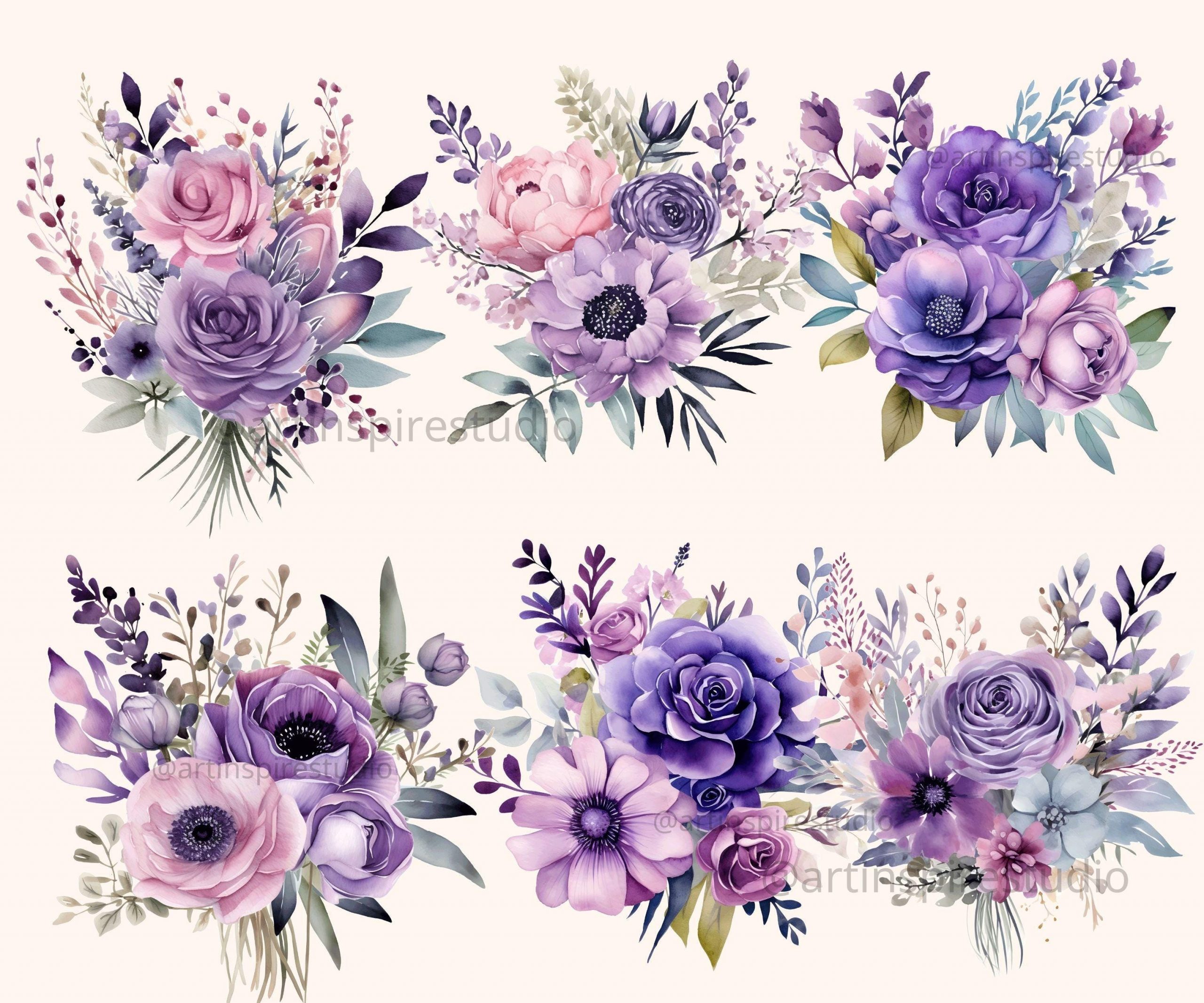 This set features hand-painted watercolor floral bunches in dreamy lavender and muted purple hues — perfect for wedding designs, digital planners, scrapbooking, and feminine branding projects.