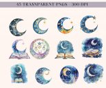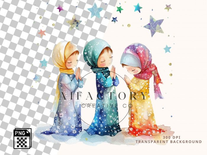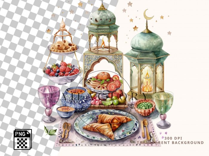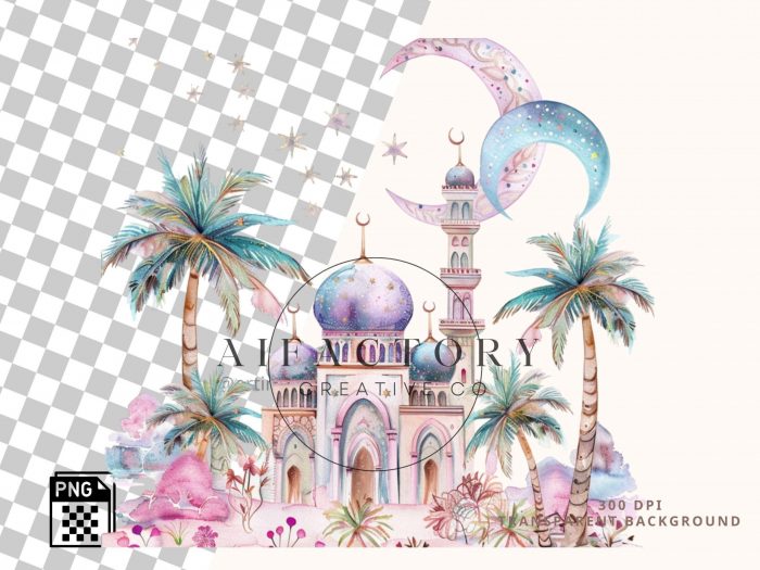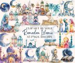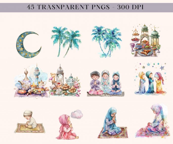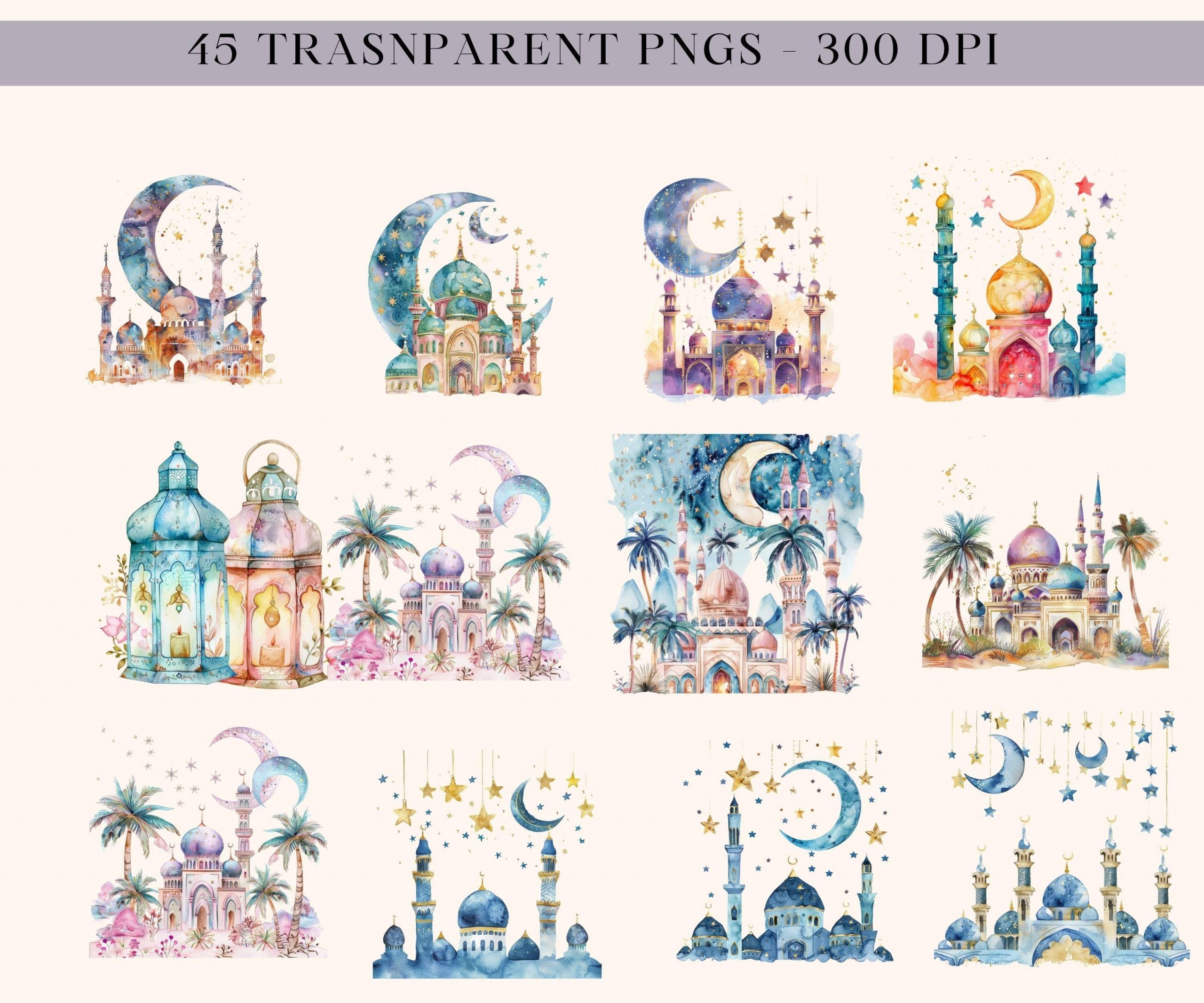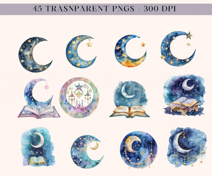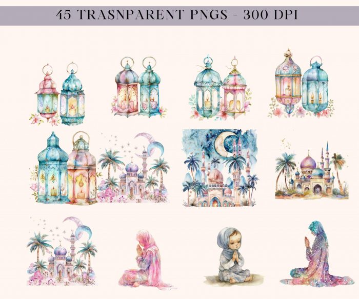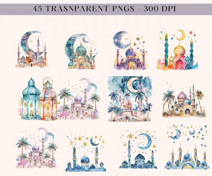 This set includes hand-painted watercolor clipart featuring Islamic symbols such as crescent moons, lanterns, Quran, prayer mats, and more — perfect for adding a spiritual and festive touch to your creative projects.